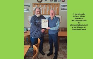 Bei dem Punkt Ehrungen wurde dem langjährigen 1. Schriftführer Christian Kiewel, der seinen Rücktritt aus gesundheitlichen Gründen bekannt gab, die Ehrenmitgliedschaft in der Gruppe übertragen und Weiler bedankte sich auch mit einem Geschenk für seine über 35 Jahre geleistete Mitarbeit. Es wurden auch Anträge zum SV für die Vergabe der silbernen und goldenen Ehrennadel an verdiente Mitglieder in der Gruppegestellt. Der nächste Punkt war die Vorstellung der Organisation der kommenden 41. Bayerischen Sonderschau, die vom 04-05.01.2025 stattfindet. Diese wird weiterhin vom GZV Maxhütte-Haidhof durchgeführt, aber es gibt mit Zuchtfreund Heinrich Gross einen neuen Ausstellungsleiter. Es wurden auch noch weitere Ausstellungstermine vorgestellt und besprochen: